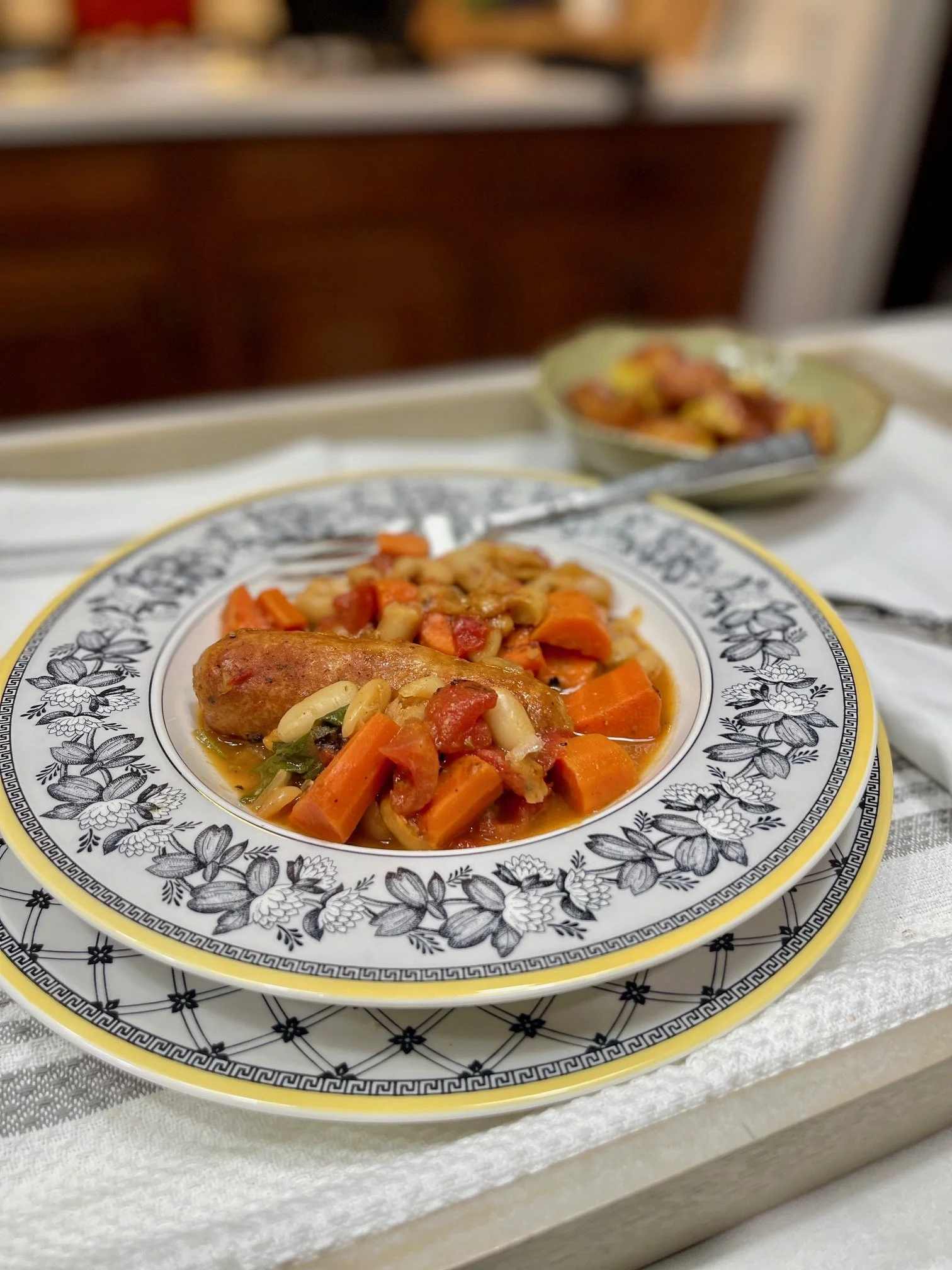 I was home recently, recuperating from Covid and I decided to make a quick version of a French peasant dish called cassoulet. It is something I discovered from my travels in France but this is a much faster, cheaper version and I happened to have all of the ingredients in my pantry or freezer. I learned this from Jacques Pepin; he is a master when it comes to using what you have in your freezer and pantry. Serve it with a slice of warm crusty bread. It is cozy and comforting, just the ticket as the weather turns colder or you have a cold. 🤧